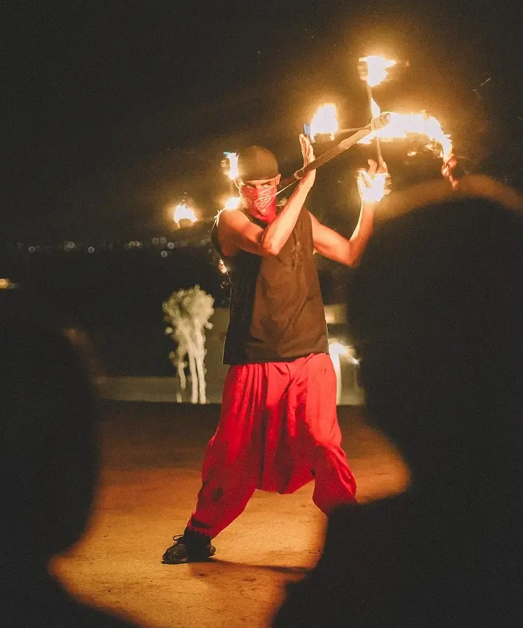 Jantar marroquino de três pratos, servido sob o céu estrelado, com música tradicional, show de fogo e dança do ventre.