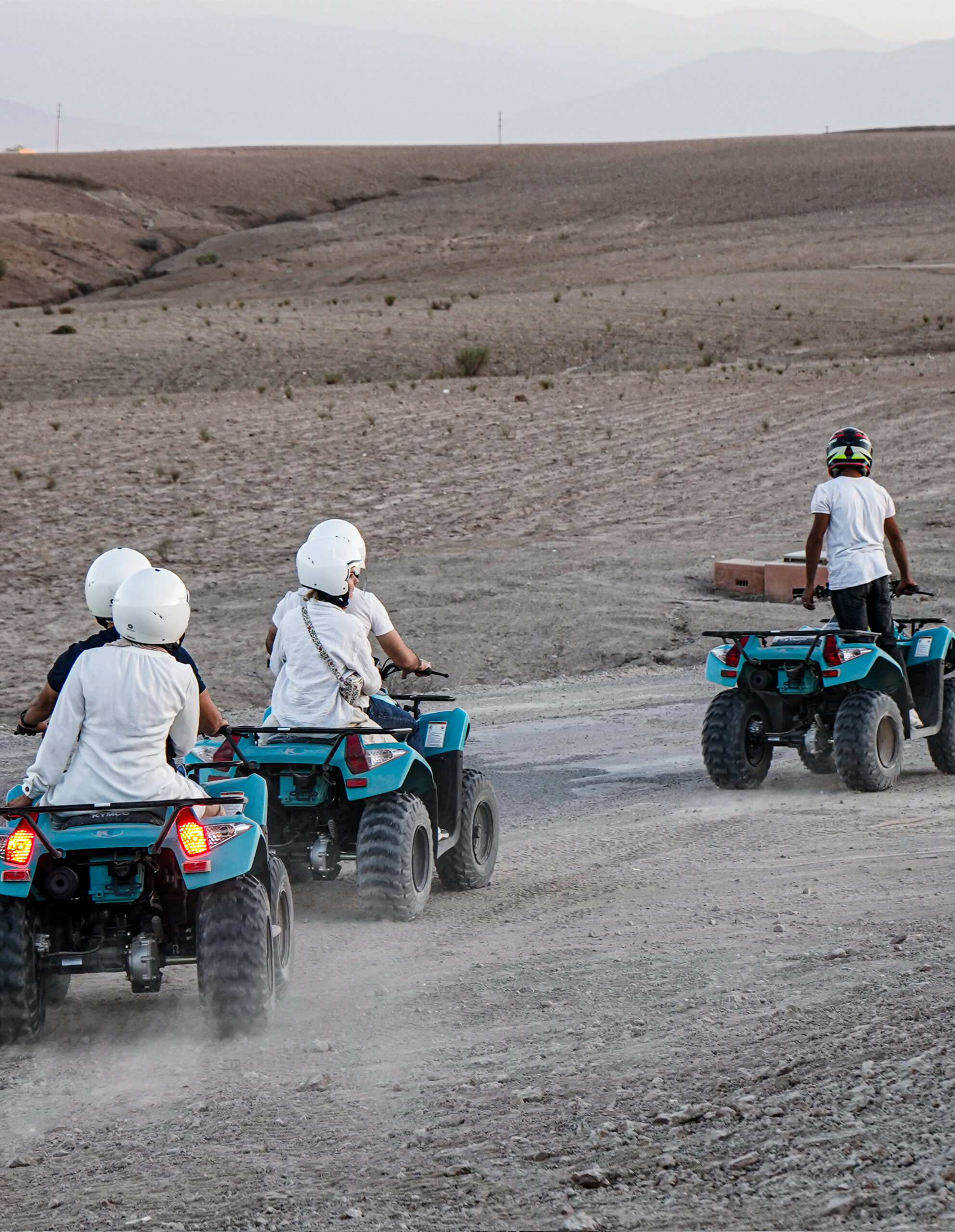 Início do passeio de quad pelos trilhos do deserto, após um briefing de segurança e fornecimento de capacete e óculos de proteção.
